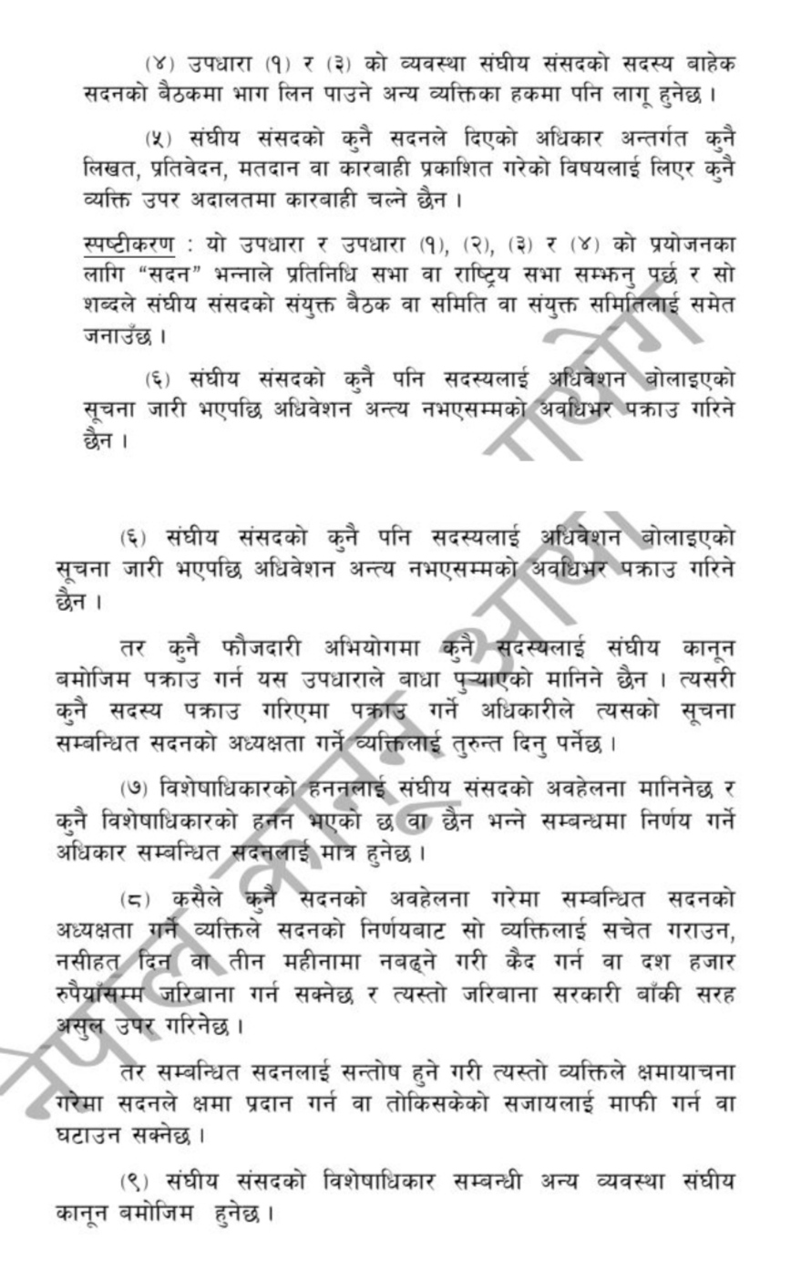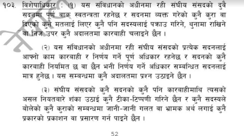 विशेषाधिकार प्रयोगबारे संविधानको धारा १०३ मा व्यवस्था छ । संविधानको धारा १०३ को उपधारा २ मा लेखिएको छ ‘ यस संविधानको अधीनमा रही संघीय संसद्‍को प्रत्येक सदनलाई आफ्नो काम कारबाही र निर्णय गर्ने पूर्ण अधिकार रहनेछ र सदनको कुनै कारबाही नियमित छ वा छैन भनी निर्णय गर्ने अधिकार सम्बन्धित सदनलाई मात्र हुनेछ । यस सम्बन्धमा कुनै अदालतमा प्रश्न उठाइने छैन ।’