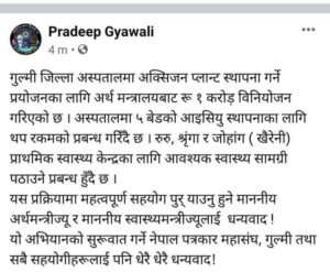मन्त्री ज्ञवालिले यस कार्यमा सहयोग गर्ने अर्थ मन्त्री र स्वास्थ्य मन्त्री र अभियान सुरु गर्ने नेपाल पत्रकार महासंघ गुल्मीलाई धन्यवाद समेत दिएका छन ।